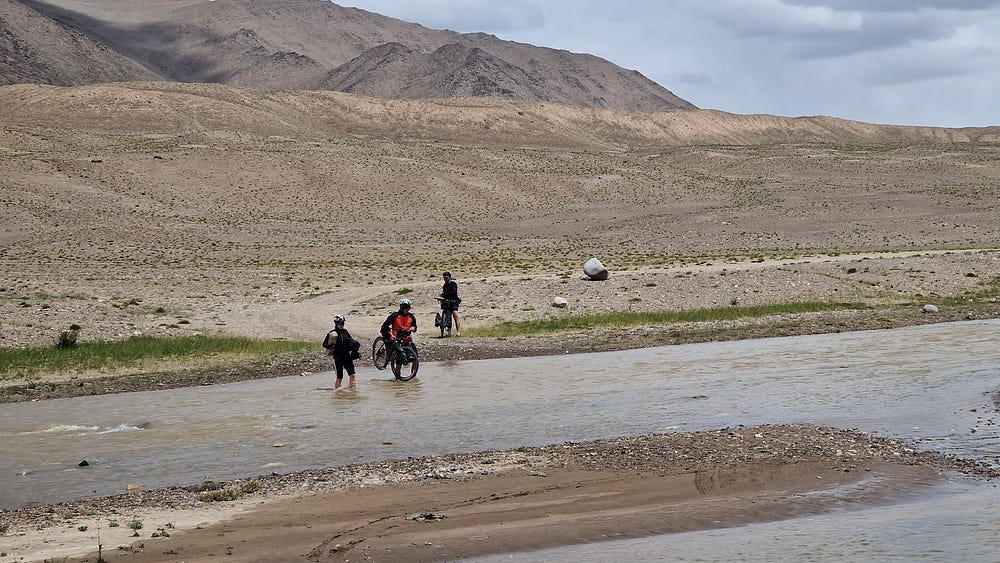 Асфальта нам осталось 20 км, а дальше — гравийно-песчаные дороги разной твёрдости. И всё против мощнейшего ветра. Брод через реку Музкол по сравнению со всем этим днём показался лёгким развлечением.