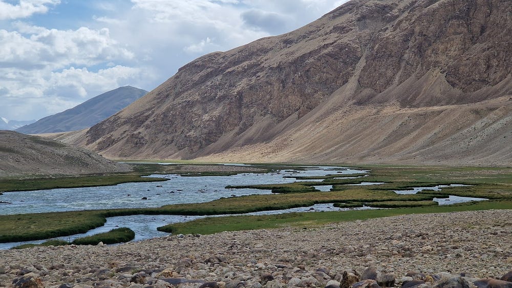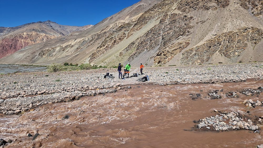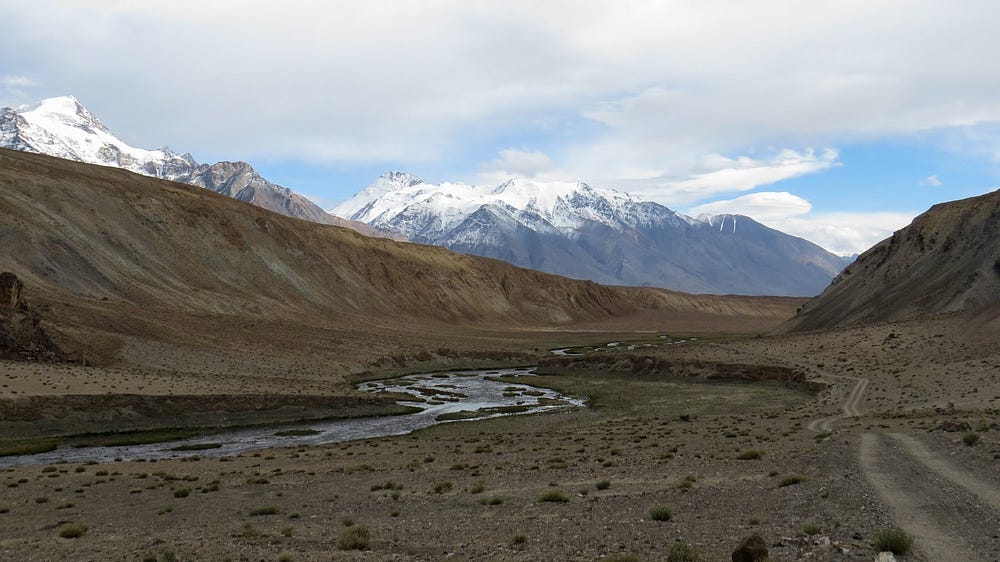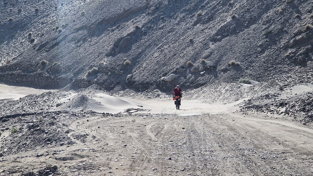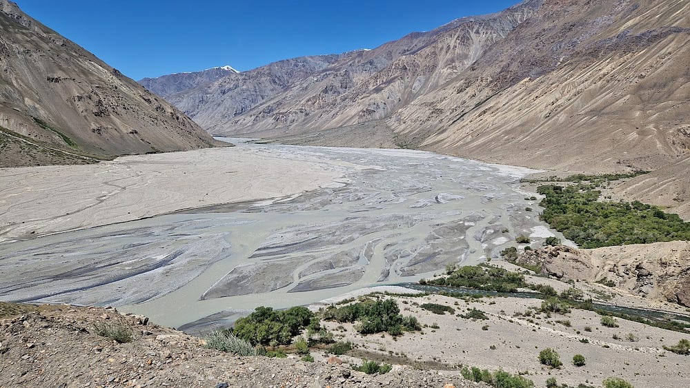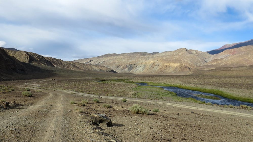 Первая половина дня — сплошь пустыня. По-своему красивая, обрамлённая раздвинувшимися Южно-Аличурским и Ваханским хребтами. И да, вчера мы незаметно отошли от реки Пяндж и теперь движемся вдоль реки Памир.