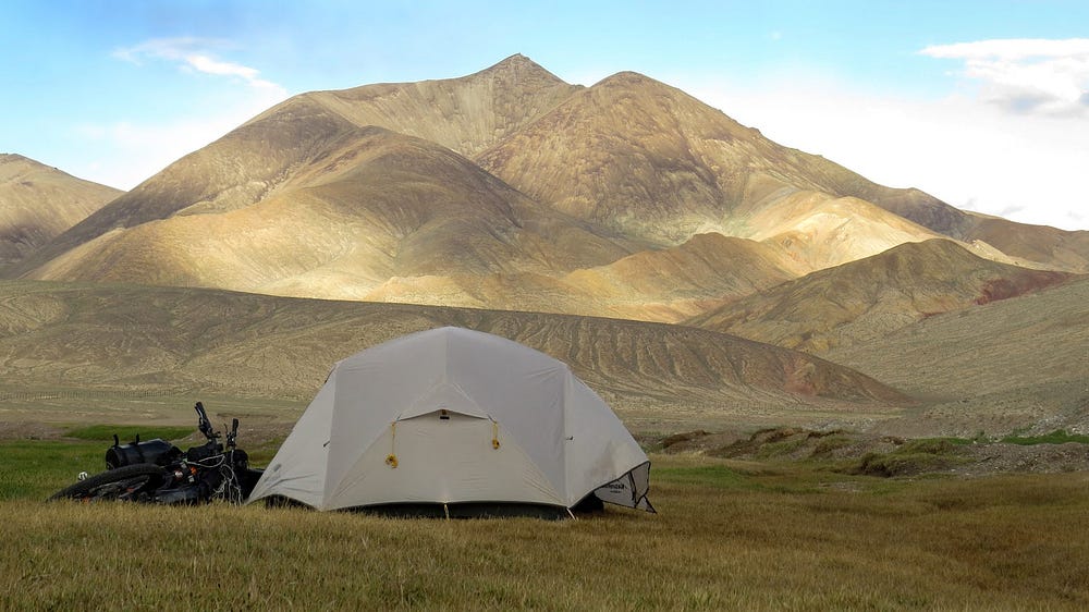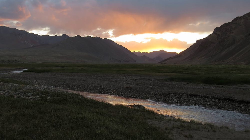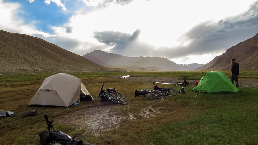 Место ночёвки выбирали не спеша, но и затягивать не хотелось. Стали на симпатичной поляне между трактом и узким рукавом реки Акбайтал Южный — на высоте 4160 м. Самая высокая ночёвка в палатках в этом походе. Ветер холодный, к ужину с прекрасным закатным видом пришлось утеплиться. Но в целом по нашим ощущениям, температура за ночь не опускалась ниже нуля.