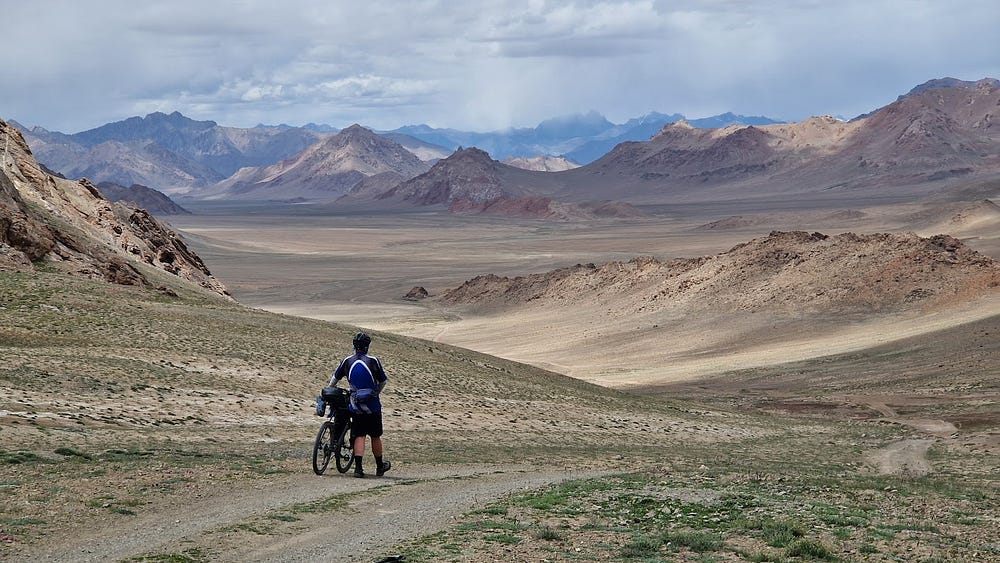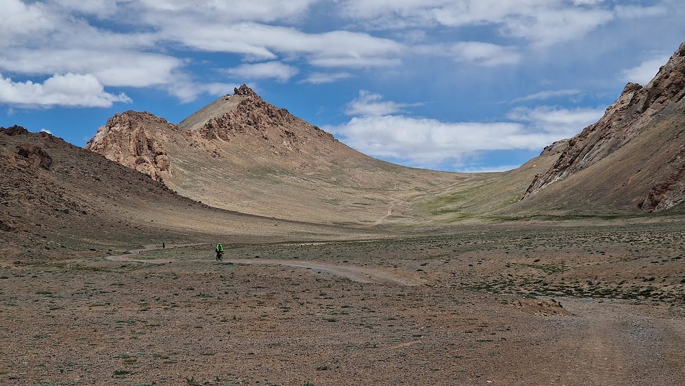 И вот самый сложный и ключевой участок этого дня. Перевал Янгидаван (4427 м) визуально очень пологий. Но заехать на него сил не оставалось: моментально забивались мышцы, сбивалось дыхание — не хватало воздуха. К тому же после обеда ехать мне стало сильно труднее. Было ощущение заполненности в области желудка — как будто он забирает на себя большую часть кислорода. Это ощущение тяжести будет преследовать меня ещё пару дней: то поднимаясь к солнечному сплетению, то опускаясь ниже. Особенно ощутимо при тряске на гравийках.