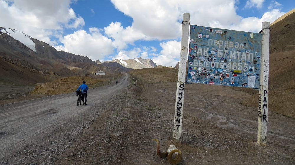 Да, мы спускались с перевала Ак-Байтал (4655 м), забраться на который для нас оказалось несложно: всё тот же плавный набор по асфальту и немного усилий на паре километров грунтовки с более крутым уклоном.