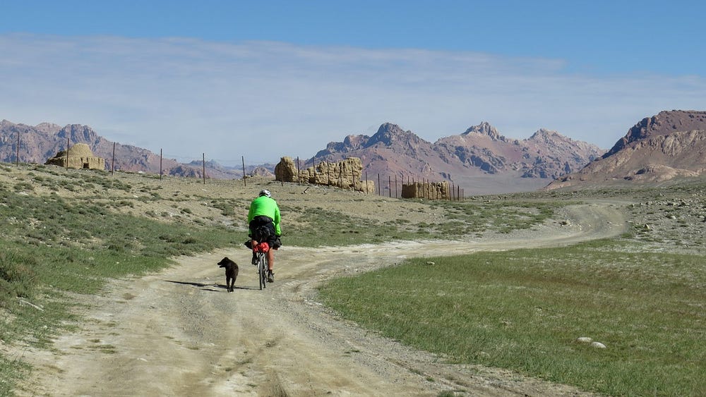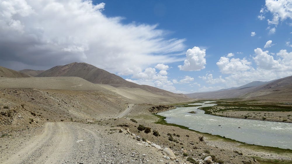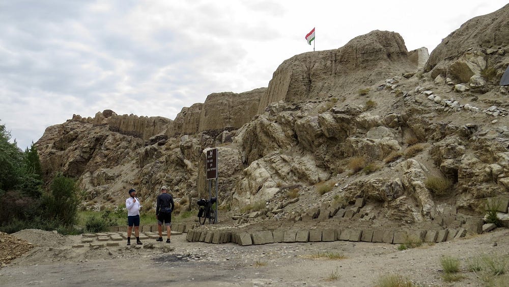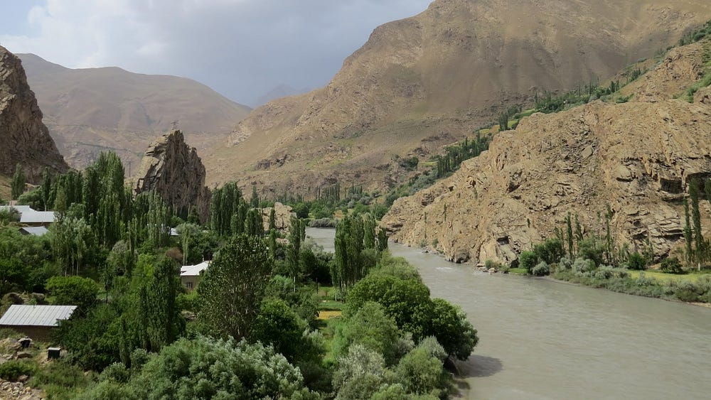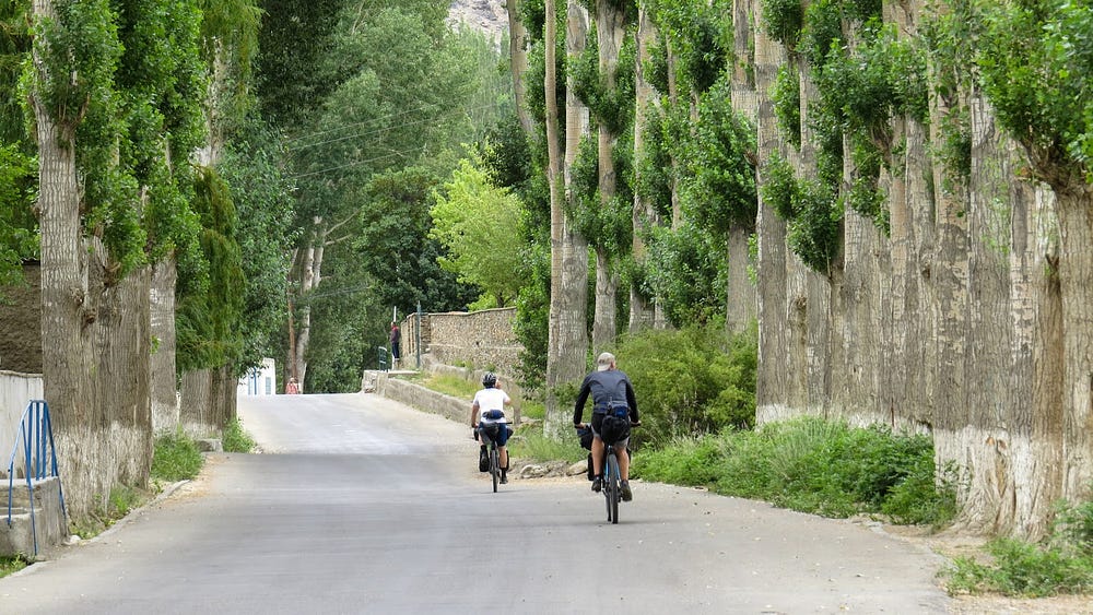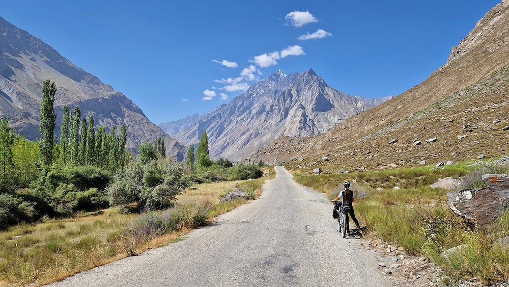 Большую часть сегодняшнего пути пейзажи однообразны: рыжие скалы и зелёные деревни с выстреливающими вверх тополями. Но… “Как только мы потеряли Антона, начались красивые виды”, — ответил Максим на мои восторги от окружающей нас зелени долины реки Пяндж. На самом деле, не только виды. Ветер, поднявшийся после обеда, стал преимущественно попутным, приятно подталкивая на подъёмах и ускоряя на спусках.