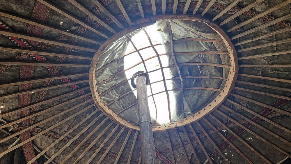 Семья большая, но по-русски почти никто не говорил. Только молодой парень, с помощью которого и удалось обо всём договориться. Для ночлега нам предложили уютную комнату, аналогичную той, где мы спали в первую ночь, только без современной мебели. У памирского дома по центру основной комнаты — световой фонарь. Видимо, раньше использовался для отведения дыма из очага. В кыргызском гостевом доме мы такого не увидели.