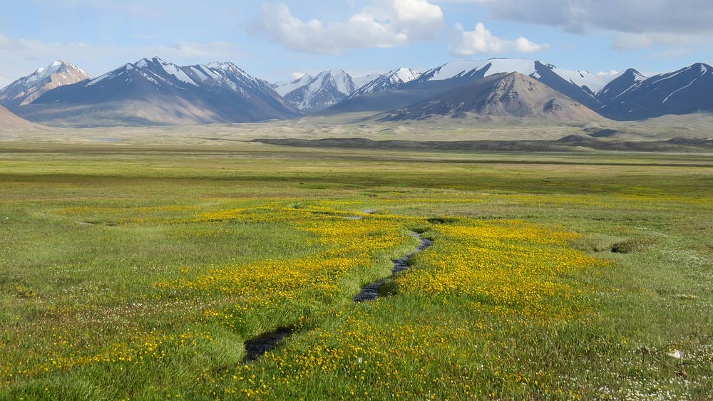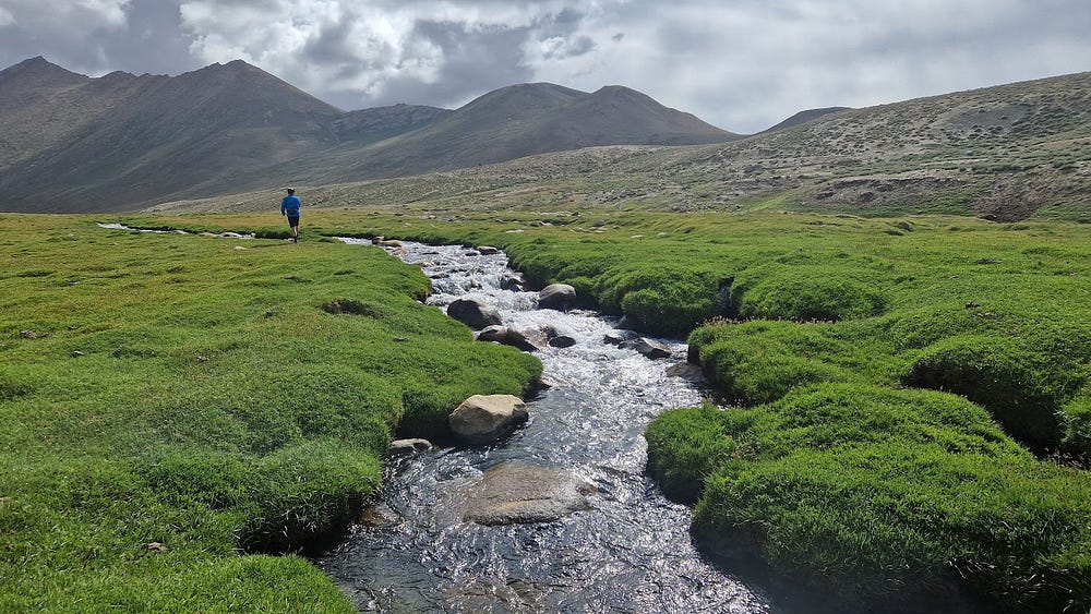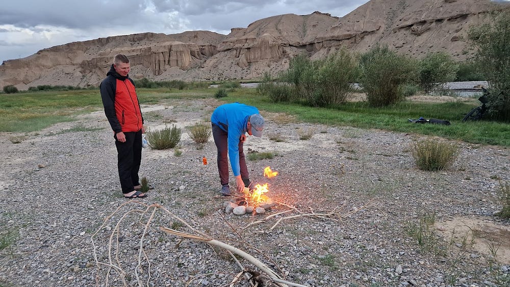В общем, искать место под палатки в темноте и на растоптанной скотом в грязь территории было холодно и некомфортно. И тут выручил пастух, показав ровную зелёную площадку у воды. Только идти к ней нужно было аккуратно — можно провалиться в сурочьи норы.