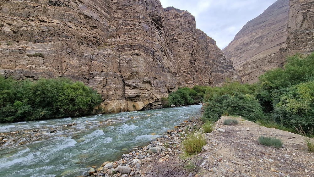 В течение всего дня настрой позитивный. После обеда мы едем по узкому ущелью. Дорога почти без наборов, у самой реки Бартанг. Серая мутная вода в тени красиво отражает подсвеченные солнцем бежевые скалы. Не виденные мною ранее пейзажи вызывают восторг!