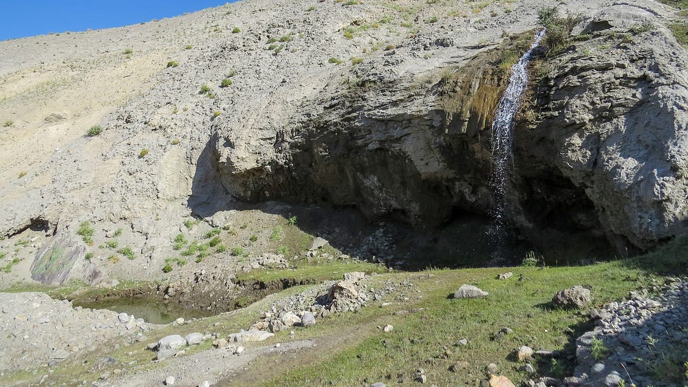 К водопаду — месту нашей стоянки — прибыли в сумерках. Ужинали под светом почти полной луны, прекрасно освещавшей всё вокруг — и нас в том числе. Меня смущали странные огни фонариков на афганской стороне реки. И обозреваемость нас с дороги. Чтобы не повторять вчерашний тревожный сон (первые дни всегда плохо спится), впервые в жизни решила выпить снотворное — оно помогло быстро уснуть. И никакой тревожности этой ночью, несмотря на то, что рядом шумел водопад, а по дороге то и дело проезжали машины.