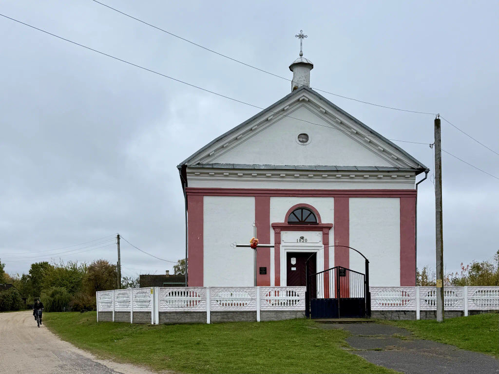 Прекрасными грунтовым дорогами, объезжая поля и леса, по которым вел изначальный трек, въехал в агрогородок с названием, которое невозможно правильно прочитать с первого раза.