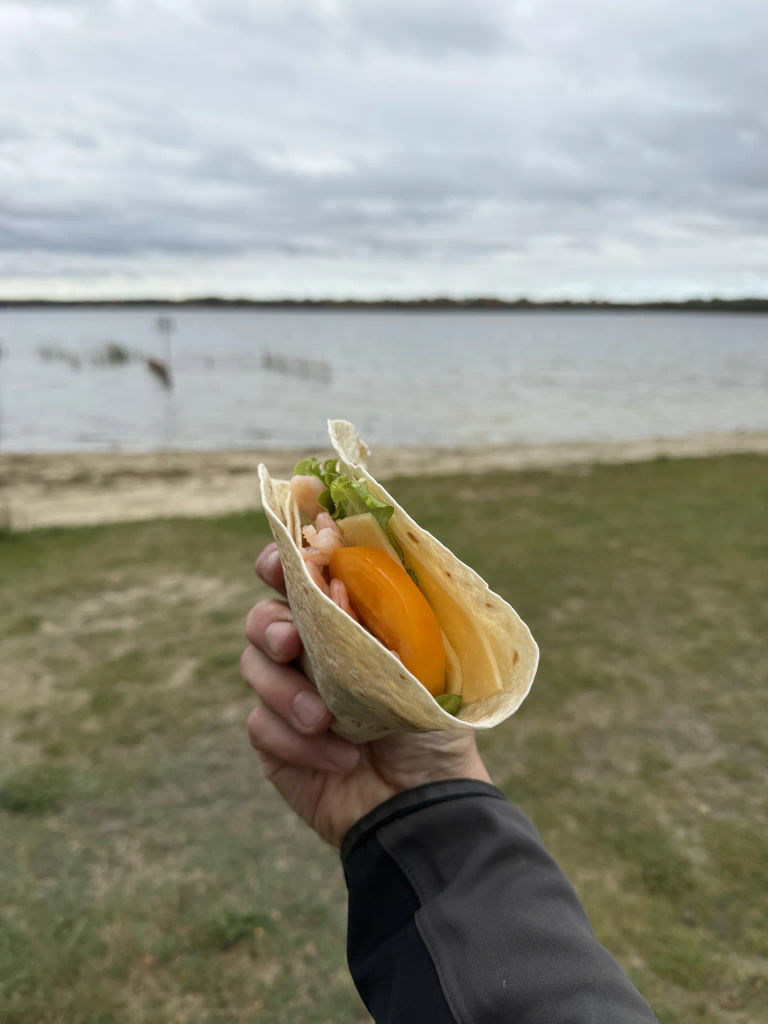 Сходил к воде, зачерпнул руками пару горстей креветок и сделал себе бутерброд, соответствующий тематике покатушки.