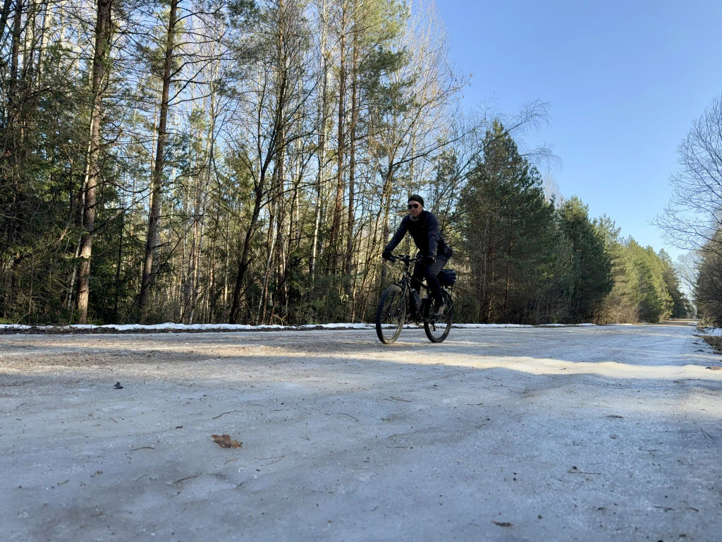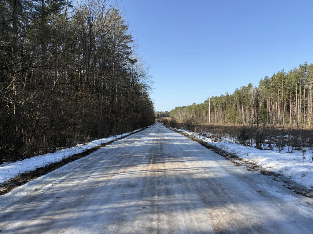 После Полонки началась гравейка покрытая серым льдом. Лес слева и справа от нее дают тень в течение дня и дорога не собирается оттаивать.