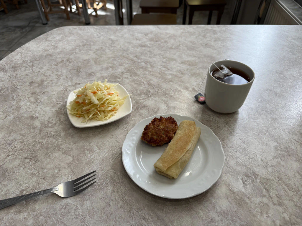 На входе сшибает с ног запах свежего хлеба. Кроме буханки за 2,5 рубля глаза разбегаются от обилия других блюд: котлета из моркови, котлета из фасоли, котлета из гречки. Я остановился на рыбной котлете, блинчике с картошкой, капустном салате и чае. Обошлось все в 6,5 рублей.